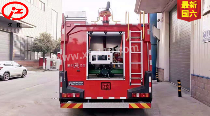 乘員室為原裝雙排,可乘坐2+4人,該車為外露罐結構,車身前部為器材箱,中部為水罐,后部為泵房。載液罐體為優質碳鋼,內部噴涂環氧底漆及環氧瀝青漆,