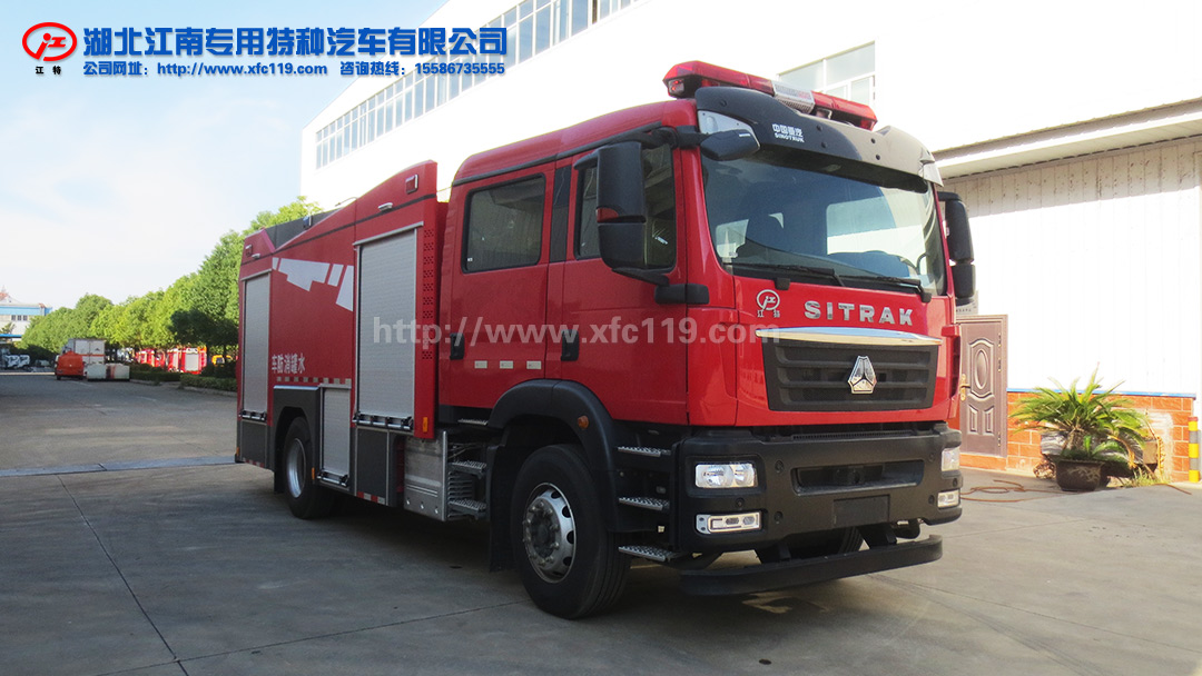 JDF5180GXFSG70/Z6型水罐消防車采用中國重汽集團濟南商用車ZZ5206N471GF5底盤改裝而成。整車由消防員乘員室和車身兩大部分組成,乘員室為原裝雙排,可乘坐2+4人,該車為外露罐結構,車身前部為器材箱,中部為罐體,后部為泵房。載液罐體為優質碳鋼,內部噴涂環氧底漆及環氧瀝青漆,與底盤采用彈性連接,載水7150kg,裝備了上海雄真消防設備有限公司生產CB10/60-XZ型常壓消防泵,額定流量60L/S,車頂安裝成都威斯特消防機械有限公司生產的P8/60W型車用消防炮。該車最大的特點是載液量大、操控性好、維修簡便。可廣泛應用于公安消防隊、廠礦企業及社區、碼頭等場所,撲救大型油類火災和一般物質火災。