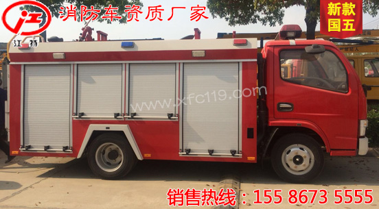 該車的另外一種國五消防車車型為雙排的小東風2600軸距的水罐消防車車型,這樣設計是方便救火人員乘坐,有限的長度加大了整車的使用率,上戶噸位0.6噸,可做到1.2-1.5噸。兩款車型都降低了對使用者駕照的要求,方便了企業對消防車使用的一些硬性條件。