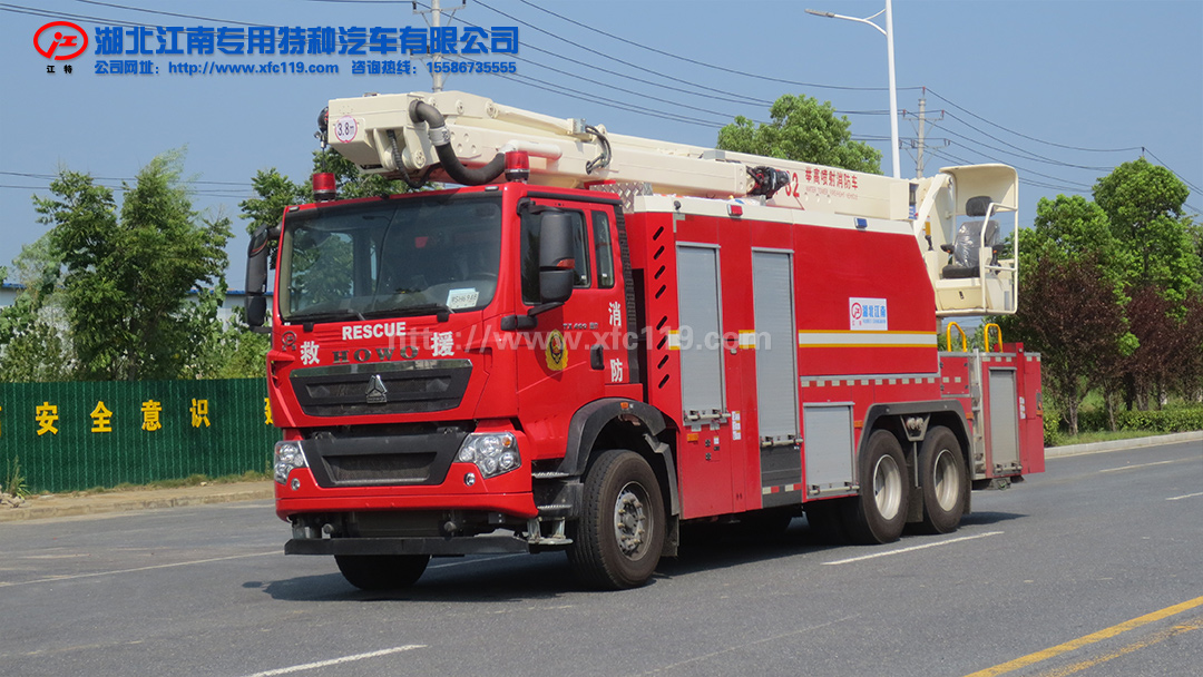 江特牌JDF5330JXFJP32型舉高噴射消防車選用中國重汽T系列豪沃消防車底盤,原廠單排雙開門駕駛室,可載含駕駛員在內的乘員2人,駕乘舒適輕便;集水罐車、泡沫車、高噴車三者功能與一身,具有高層滅火、火場監控、快速作戰等國內先進水平高性能多功能消防車。該車采用電液比例及下車集中控制技術,是全液壓驅動、伸縮加折疊臂式消防車;同時該車自帶7噸水罐及2噸泡沫罐,可在距離水源較遠的位置完成消防作業。該車綜合應用新技術、新工藝、新材料并結合自身技術優勢,豐富高噴車的功能配置,提高高噴車的單車作戰能力。該車可廣泛應用于城鎮、工礦企業等中高層建筑及石油化工企業、油罐、倉庫等高大建筑的火災撲救,也可作為水罐泡沫車單獨使用。