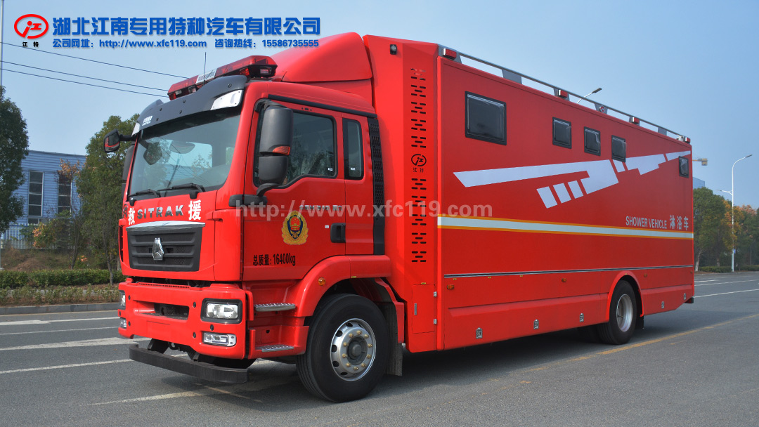 湖北江南專用特種汽車有限公司“江特牌”淋浴車系列產品,專用于改善野外生活保障條件,提高野外執行任務保障能力。廣泛適用于軍隊、公安特勤、消防、醫療衛生、搶險、應急救援等多種用途。車內配置齊全,完全滿足單次 8 人同時淋浴保障用途。整車主要由機動性能較高的二類底盤、水電保障系統、淋浴設備等組成。該車主要特點: